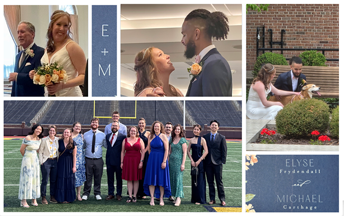 Ellie and Michael's wedding was wonderful: the bride was beautiful, the groom handsome, the setting perfect, and the dancing joyous. The reception at the UM Big House gave us all the opportunity to take a group photo on the field, with current and former group members from across the country (and Schuyler just back from Amsterdam).