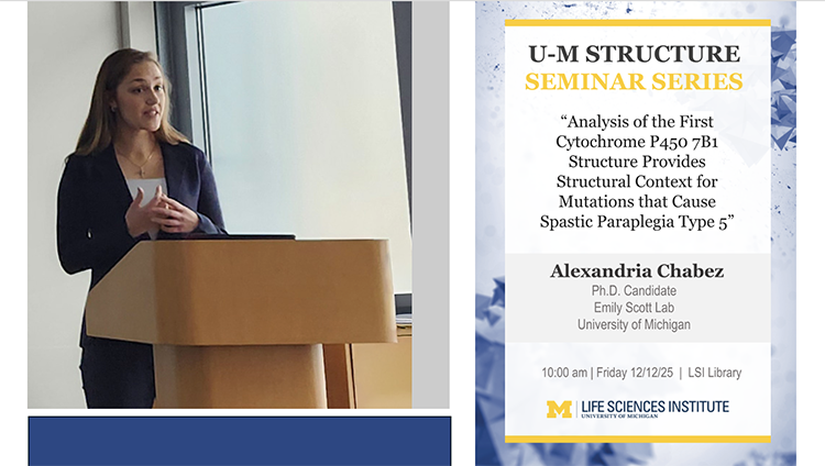 Biological Chemistry graduate student Alexi Chabez presented her structure/function work on human cytochrome P450 7B1 in the Friday morning UM structural biology seminar series. CYP7B1 is involved the the synthesis of the bile acid chenodeoxycholic acid and defects in this protein cause the neurological disorder spastic paraplegia type 5 (SPG5).